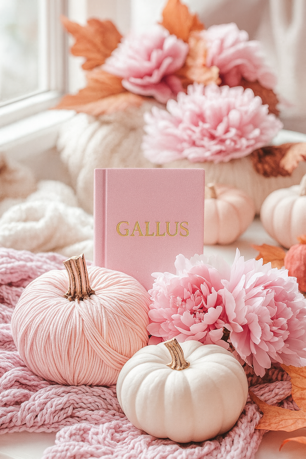 "Create an ad for the [product description] in the image attached. Romantic autumn lifestyle advertisement. [PRODUCT] is positioned upright on a windowsill, surrounded by decorative pumpkins including one crafted from pink yarn with a ribbed texture and one smooth white pumpkin. Large blush pink flowers (such as peonies or dahlias) frame the scene. The setup rests on a chunky knitted pink blanket with additional soft cream textiles in the background. Autumn leaves in warm orange hues are scattered subtly around. Lighting: soft natural daylight streaming through the window, creating a cozy, bright, feminine atmosphere. Style: romantic, pastel-toned editorial photography with a cozy seasonal aesthetic."